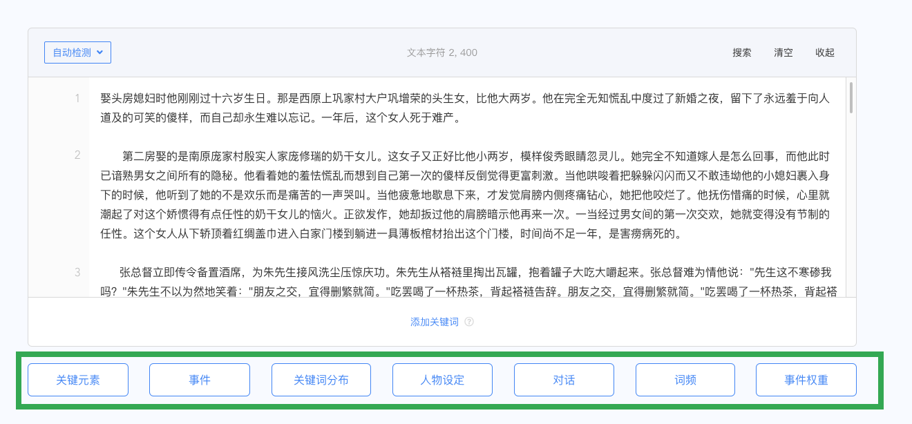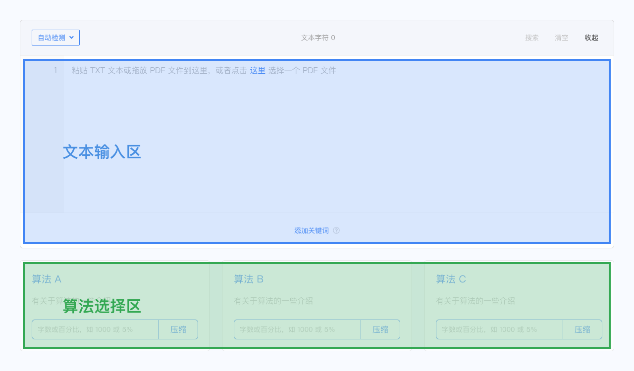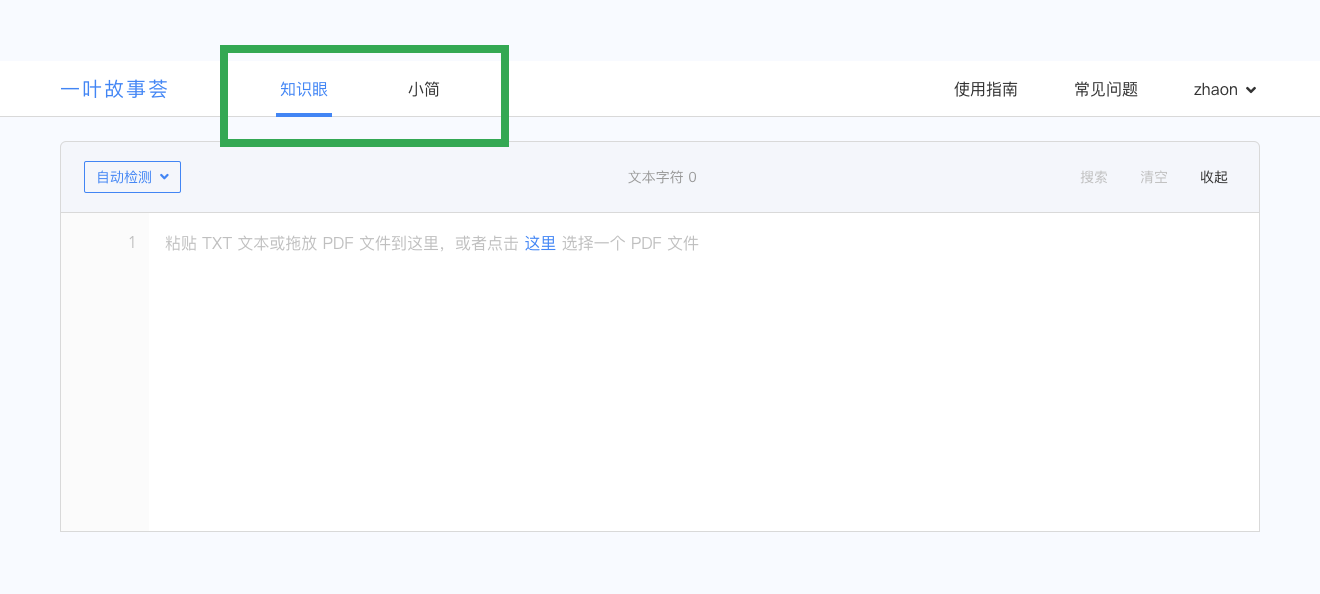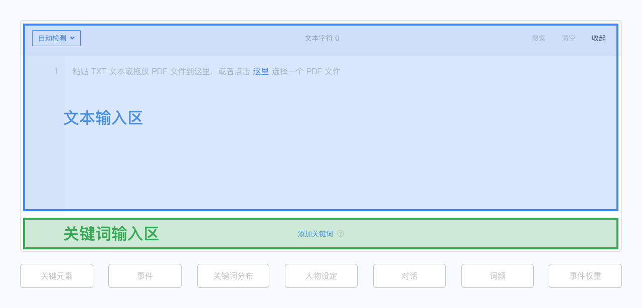 将 TXT 文本或 PDF 文件粘贴或 上传 至页面上方的文本输入区中;