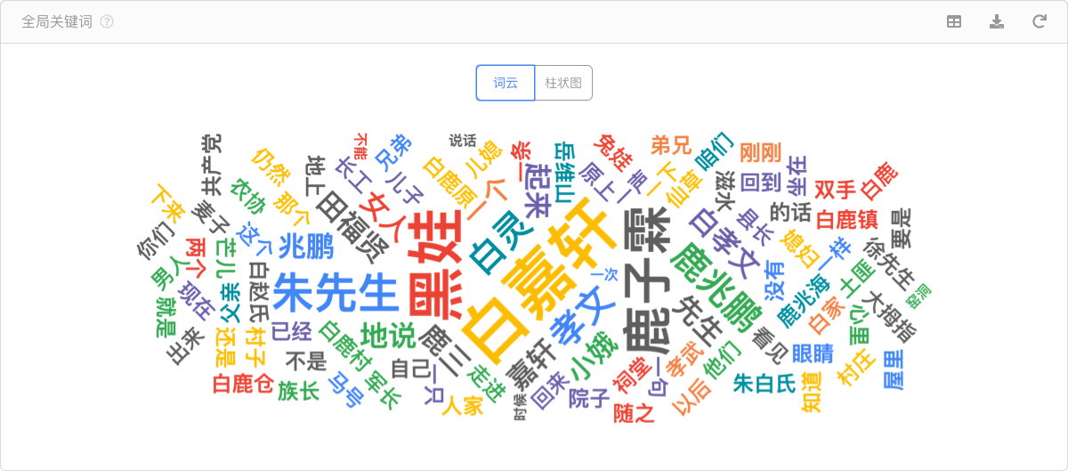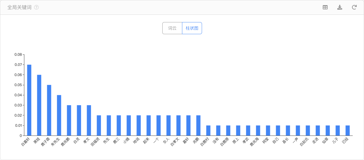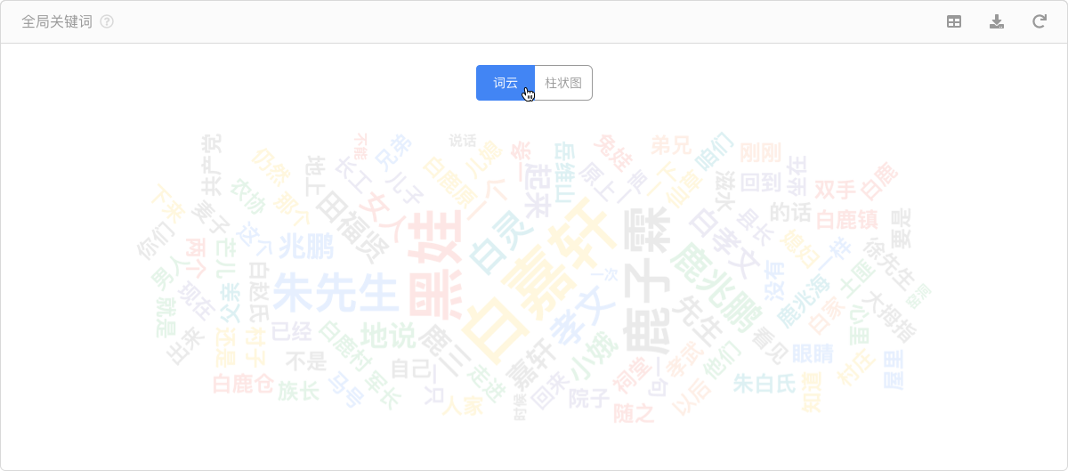 以 词云 及 柱状图 的方式展示文本中高频出现的关键词,可通过卡片上方的 图表切换 按钮,在 词云 与 柱状图 之间切换显示。