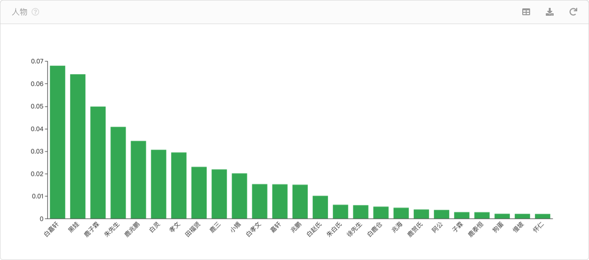 以 柱状图 的方式将文中高频出现的 人物元素 在图表中从左至右依次排列,图表纵轴表示 人物元素 的出现频率。 点击图表上的柱形或横坐标上的文字,可将其 设置为关键词。
