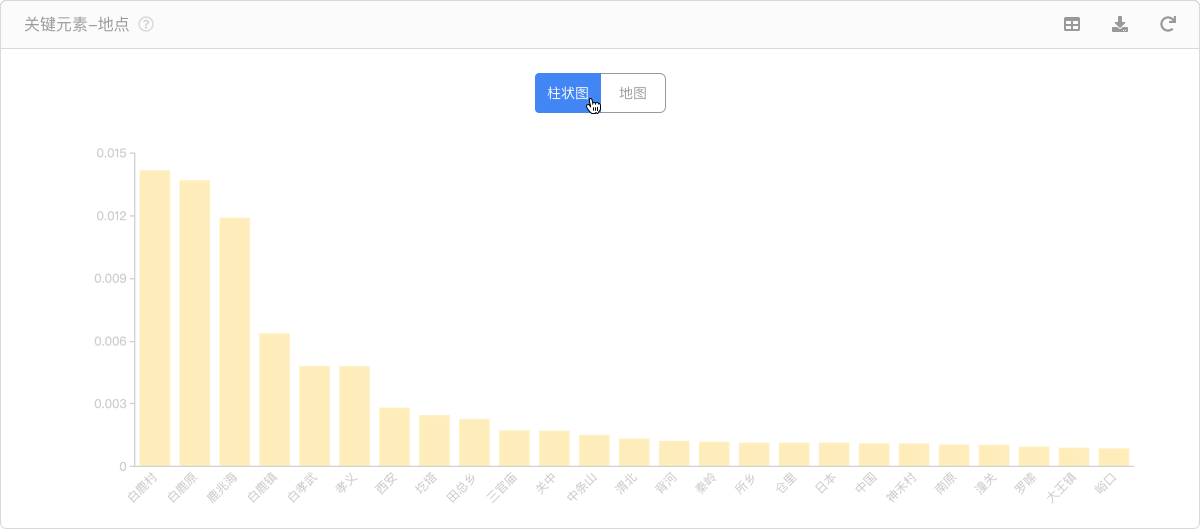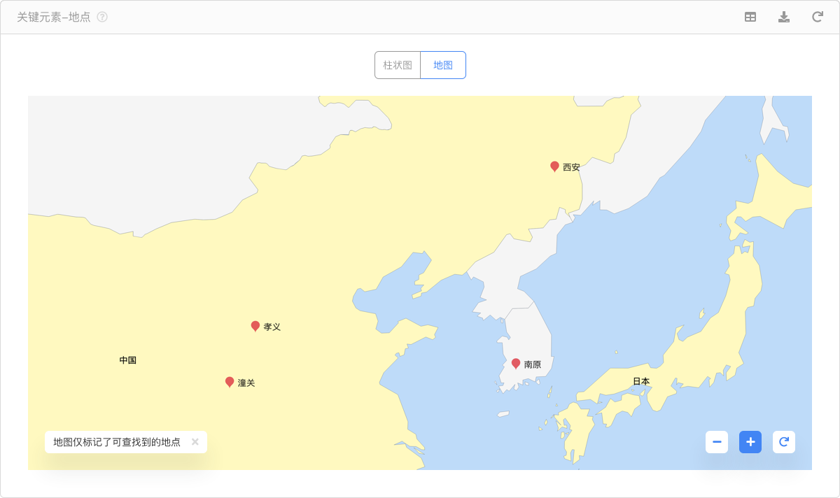 提取文本中高频出现的 地点元素 并绘制为 柱状图 及 地图。点击卡片中的 图表切换 按钮,可在 柱状图 与 地图 之间切换显示。