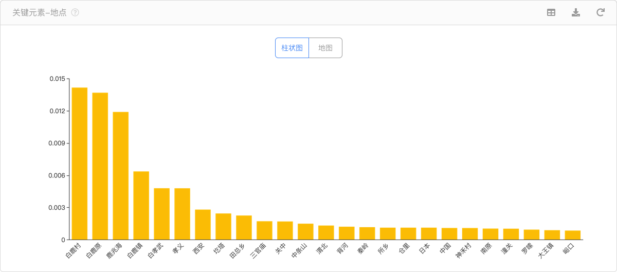 文中高频出现的 地点元素,将在图表的横轴上从左至右依次排列,图表的纵轴为 地点元素 出现的频率。 点击图表上的柱形或横坐标上的文字,可将其 设置为关键词。