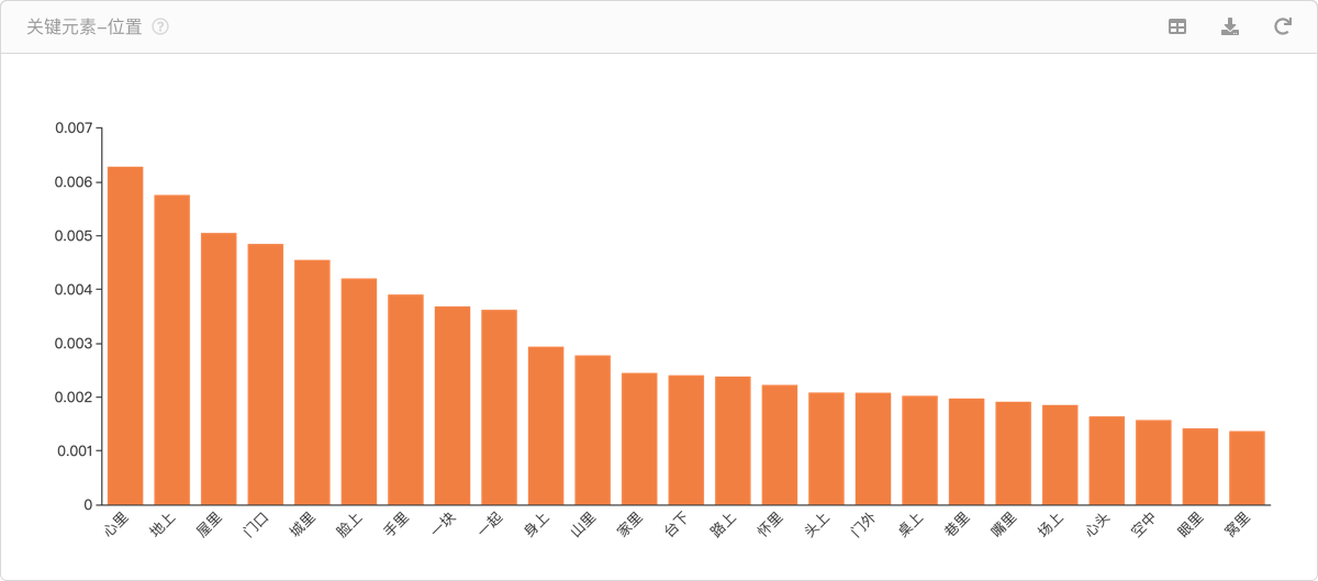 以 柱状图 的方式将文中高频出现的 位置元素 在横轴上依次排列,图表的纵轴表示 位置元素 的出现频率。 点击图表横轴上的文字或柱形,可将其 设置为关键词。
